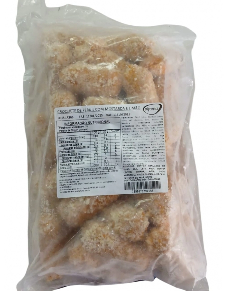 Mini Croquete de Pernil com Mostarda e Limão Alfama 1,05kg Perfeito para entradas, petiscos ou eventos, o Mini Croquete de Pernil com Mostarda e Limão Alfama combina a suculência do pernil com um toque cítrico e levemente picante, garantindo um sabor sofisticado e irresistível. Cada caixa contém 3 unidades, totalizando 1,05kg, ideal para servir em ocasiões especiais ou como um diferencial no seu cardápio.Armazenamento:Antes de abrir: Mantenha o produto congelado a -18°C ou menos para preservar a qualidade. Após preparo: Se não consumidos imediatamente, guarde os croquetes em refrigeração (máximo 4°C) por até 24 horas. Dica extra: Para melhor textura, evite recongelar após o descongelamento.Validade:Consulte a data no rótulo da embalagem (geralmente 12 meses a partir da fabricação quando mantido congelado). Atenção: Descongele apenas a quantidade necessária e respeite o prazo de validade pós-descongelamento.Dicas de Preparo e Servir:Forno: Pré-aqueça a 200°C e asse por 12-15 minutos até dourar, virando na metade do tempo. Air Fryer: Ajuste a 180°C por 8-10 minutos, agitando o cesto na metade do tempo. Acompanhamentos:Molho de mostarda e mel para equilibrar o sabor. Fatias de limão fresco para realçar o toque cítrico. Folhas verdes (rúcula ou agrião) para um contraste refrescante.Sugestão criativa: Use como recheio de mini pães ou como base para canapés gourmet!