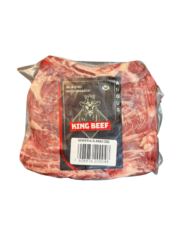 BANANINHA ANGUS 500G KING BEEF A Bananinha Angus da King Beef é um corte suculento e saboroso, perfeito para quem busca uma experiência gastronômica de alta qualidade. Com 500g de pura carne Angus, este produto é ideal para churrascos, grelhados ou pratos especiais. Validade:Verifique a data de validade impressa na embalagem. Consuma preferencialmente até a data indicada para garantir o melhor sabor e qualidade. Armazenamento:Mantenha a Bananinha Angus refrigerada entre 0°C e 4°C. Para maior durabilidade, pode ser congelada a -18°C. Após descongelar, consuma imediatamente e não congele novamente. Dica de Preparo:Tempere a carne com sal grosso e pimenta-do-reino a gosto. Grelhe em churrasqueira ou frigideira quente, virando apenas uma vez para selar os sucos. Para um ponto médio, asse por aproximadamente 4 minutos de cada lado. Deixe a carne descansar por 5 minutos antes de servir para garantir maciez e suculência.Aproveite a Bananinha Angus King Beef e surpreenda seus convidados com um sabor inigualável!